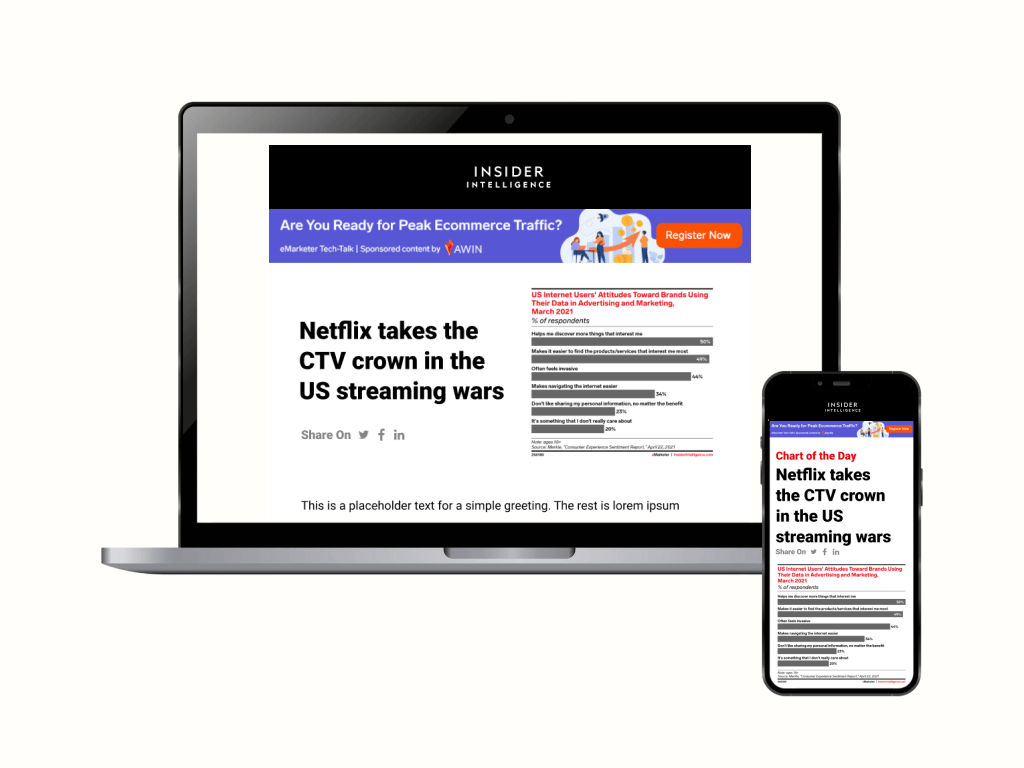Designed editorial-style marketing emails for Business Insider, translating complex data insights into visually compelling, highly readable layouts. Balanced strong typography, chart integration, and hierarchy to guide readers through dense information while maintaining brand consistency and optimizing engagement across desktop and mobile.