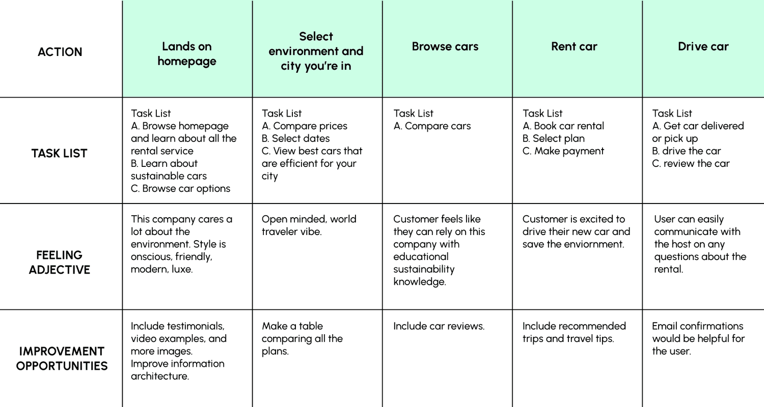 I conducted interviews and empathy maps to understand the users I’m designing for and their needs. A primary user group identified through research were adults with licenses who love to travel and being conscious about the planet. This user group agreed with the assumptions I originally had about the app. Research shows that users want the least amount of steps possible to finish the booking process. Vehicles contribute to the biggest causes of global warming and air pollution. Users want to learn more about the environmental impact of the cars as well.