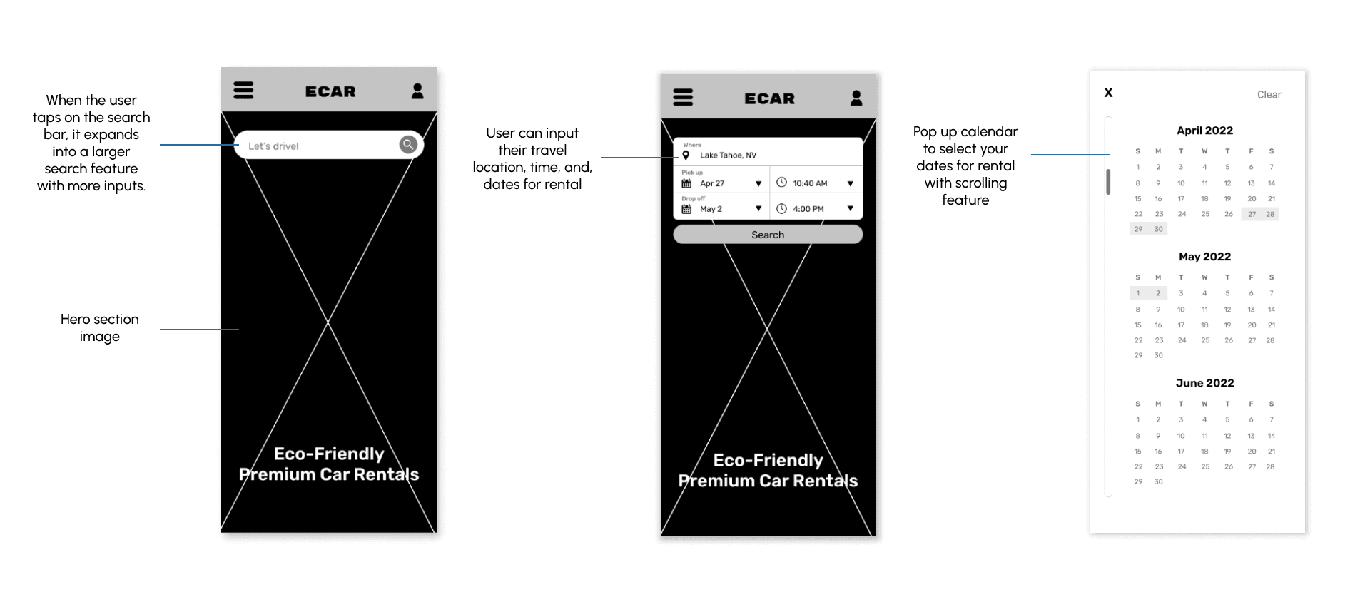The search function is the main feature of the website because it’s where people search for their car rentals. The inputs include where they user is traveling, pick up time and drop off time.