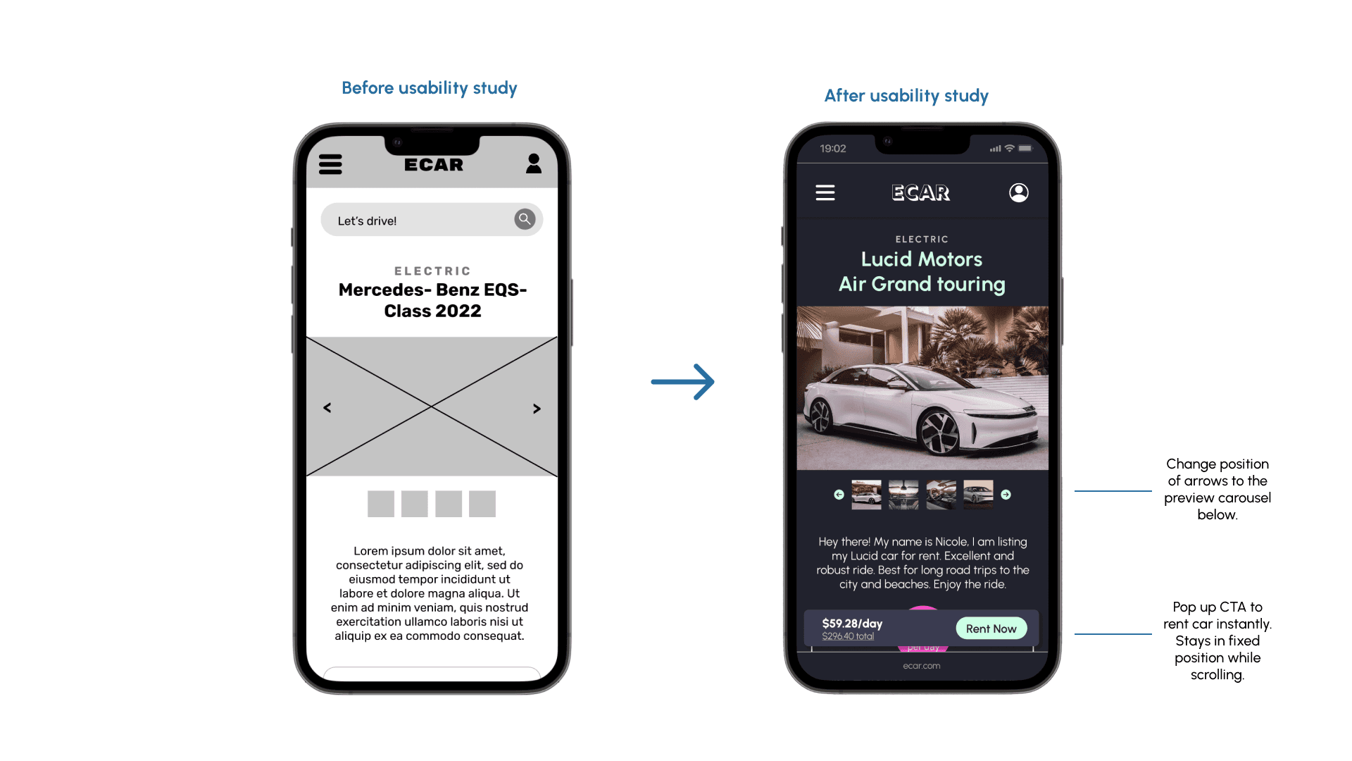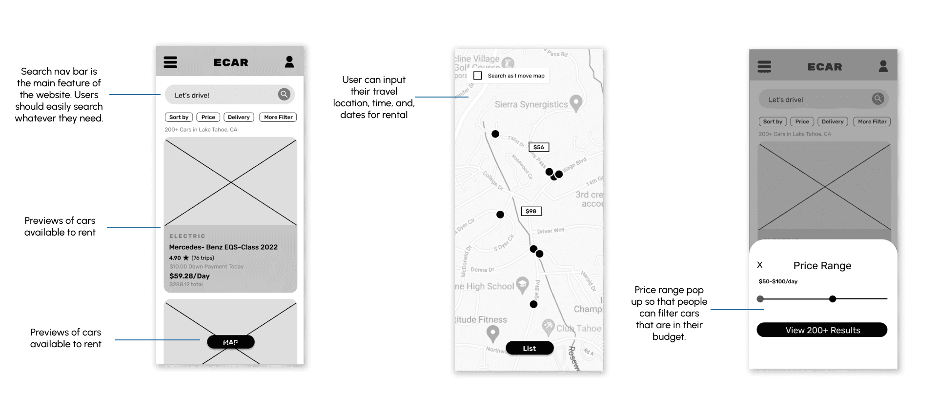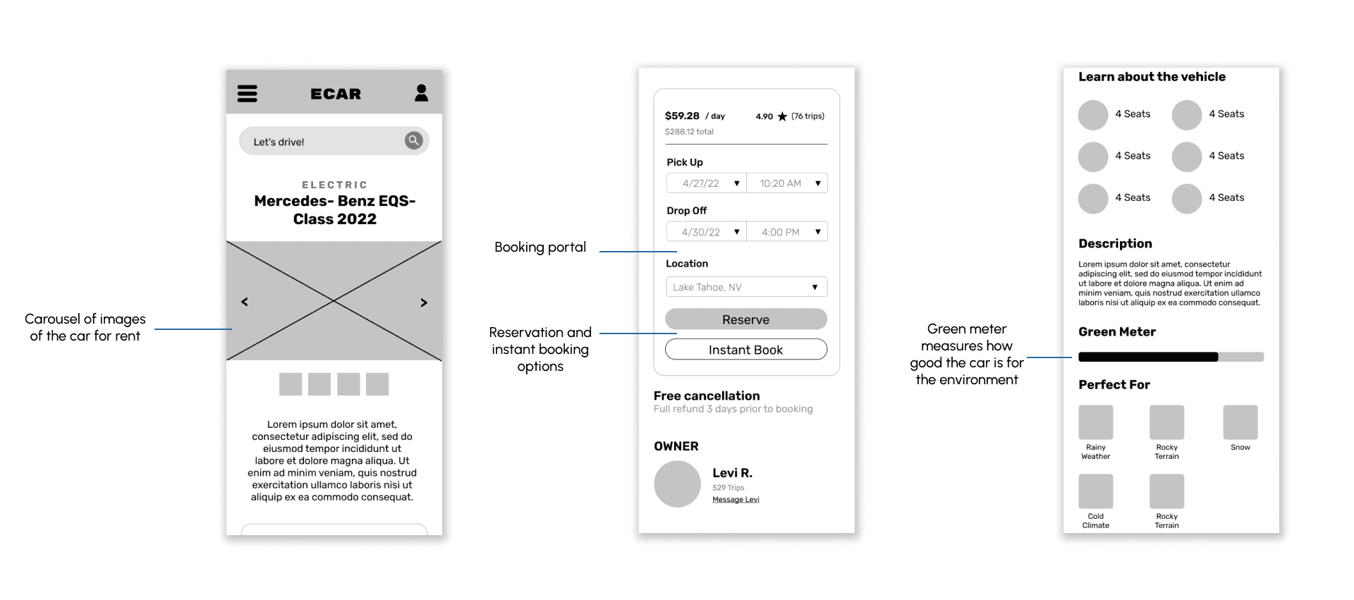 I interviewed 5 participants to gather qualitative data on their key motivations, pain points, and goals for renting eco-friendly cars online. Also researched design patterns for e-commerce flows and created competitive audits. My research spans across user research and market research.