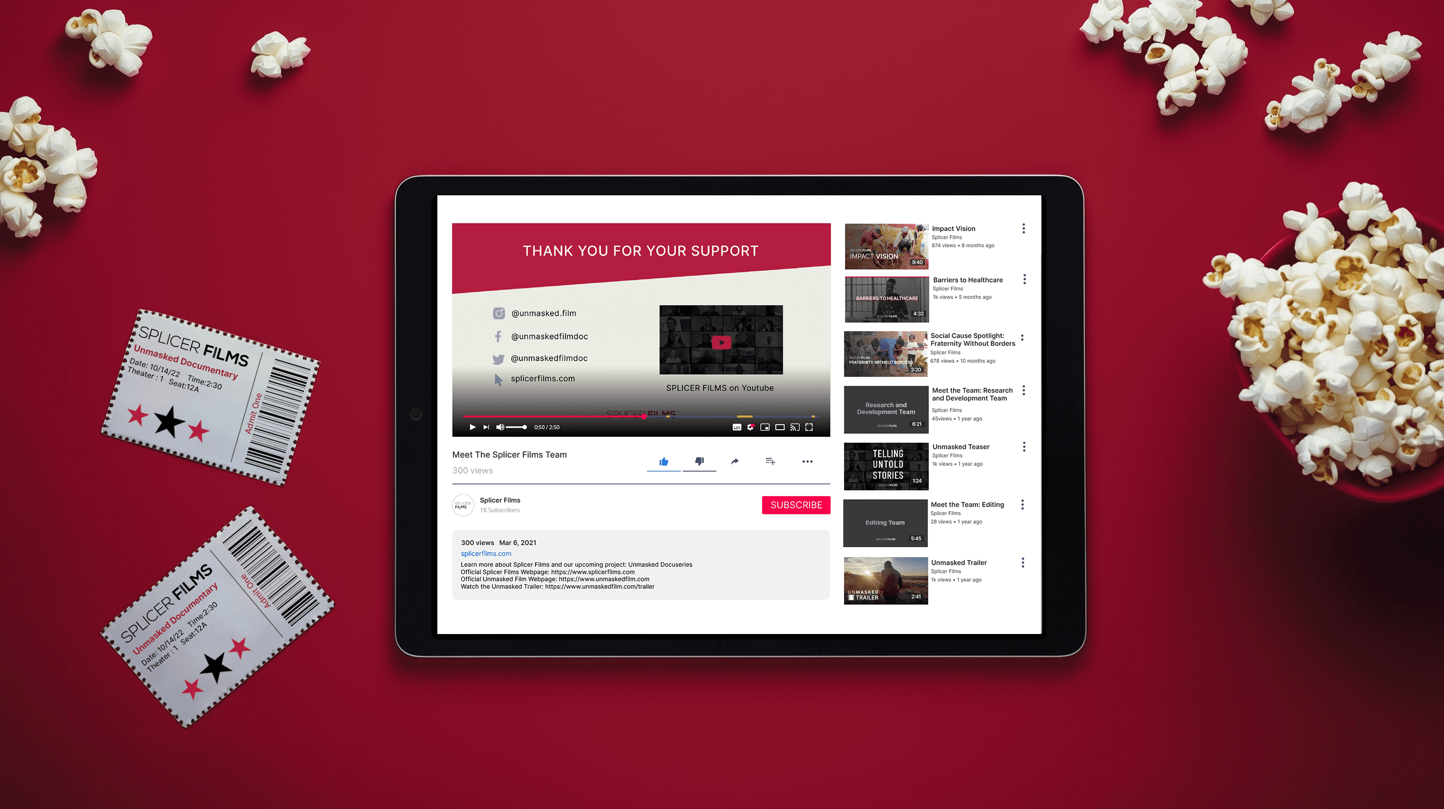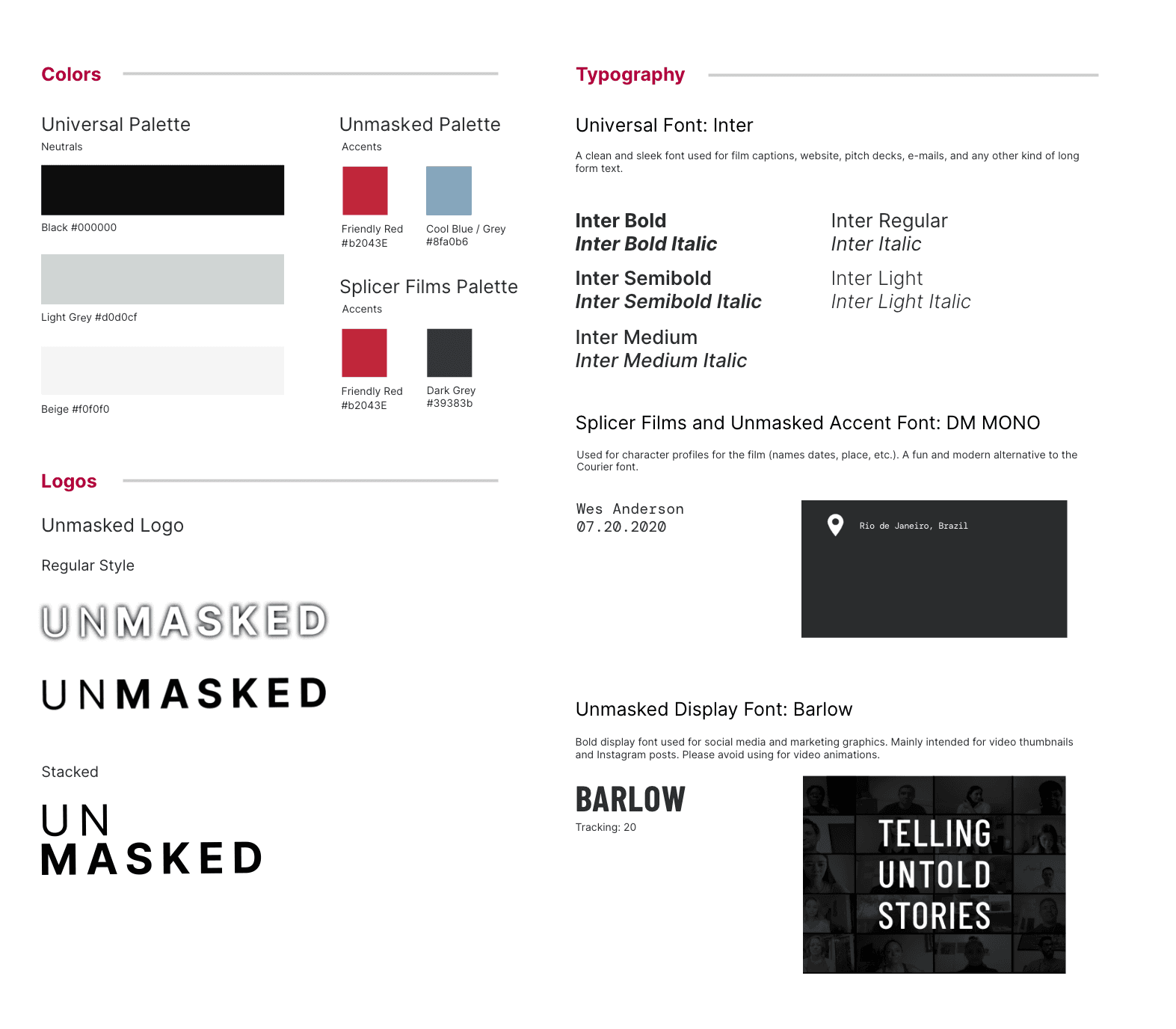 The brand identity for Splicer Films and the docuseries Unmasked creates a cohesive and unified presence that embodies the essence of both the film production company and its storytelling mission. The chosen red color serves as the primary brand hue, symbolizing passion, resilience, and hope—key themes that resonate throughout the Unmasked series. This strategic color selection not only reinforces brand recognition but also connects emotionally with audiences, encapsulating the spirit of the stories we aim to share.